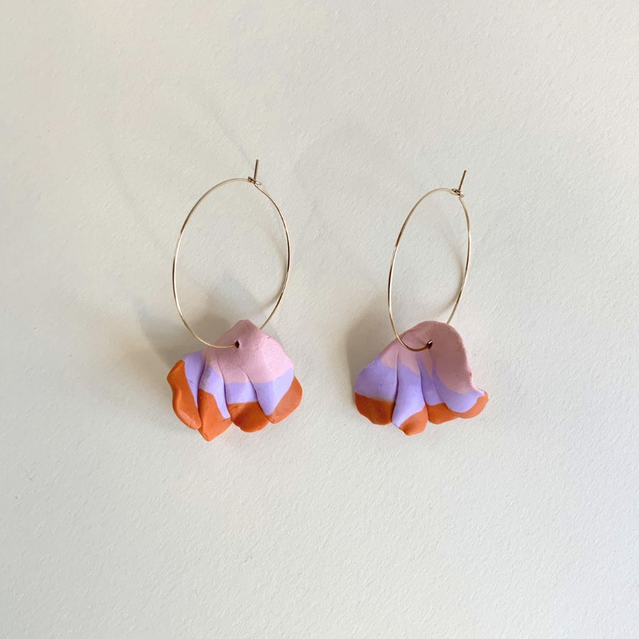 Privjesci su izrađeni u tri harmonizirana sloja boja: nježnoj pastelno ružičastoj, lila ljubičastoj i toploj terakoti, stvarajući predivan gradijent koji podsjeća na prirodne tonove cvijeća. Iako su vizualno voluminozne, naušnice su izuzetno lagane, što omogućuje cjelodnevno nošenje bez napora. Svaki par je ručno oblikovan, što osigurava unikatnost svakog primjerka iz radionice Histeria concept storea.